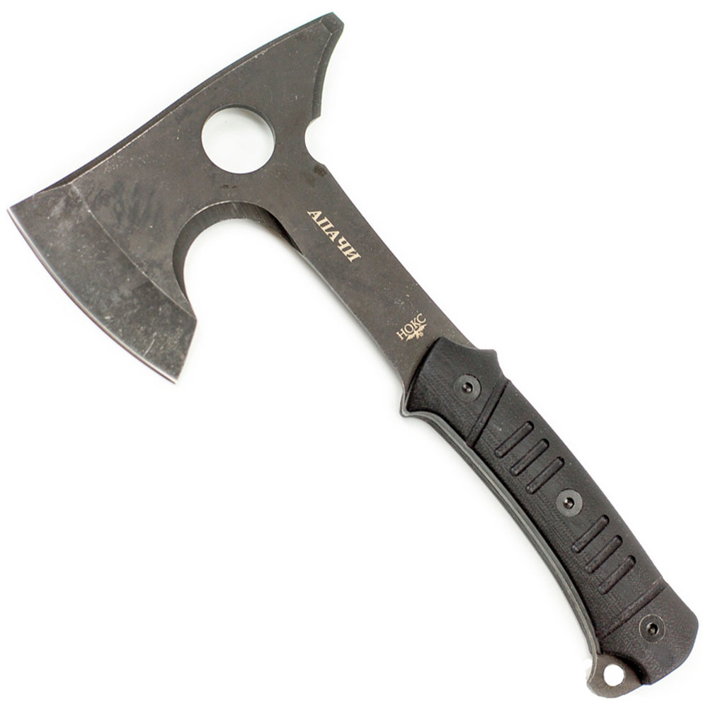 Клинок топора изготовлен стали 50х14МФ, отлично выдерживающей большие нагрузки. Режущая кромка достаточное время держит заточку. Топор имеет стойкое устойчивое к истиранию черное титановое защитное покрытие. Конструкция топора – цельнометаллическая с рукоятью в виде накладок из стеклотекстолита G10. На рукояти имеются специальные насечки для более плотного и надежного удержания. На обратной стороне находится клевец. В хвосте рукояти сделано отверстие под темляк. Для транспортировки и безопасного ношения топор снабжен нейлоновым чехлом. Характеристики топора “Апачи” Длина топора: 270 мм Длина клинка: 80 мм Ширина клинка: 140 мм Толщина обуха: 4 мм Материал клинка: нержавеющая сталь 50Х14МФ Твердость стали: 48-50 HRC Материал рукояти: стеклотекстолит G-10 Вес: 340 грамм Комплектация: нейлоновый чехол